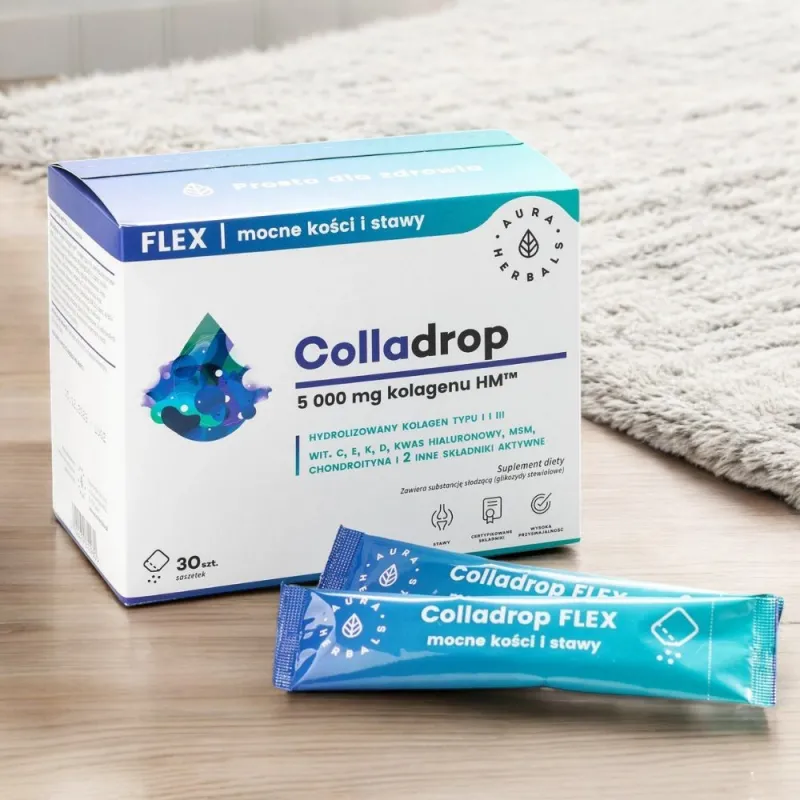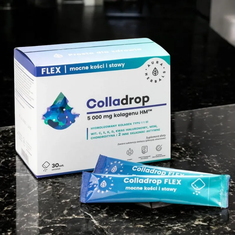 Colladrop Flex to wysokiej jakości suplement diety od Aura Herbals, zawierający 5000 mg kolagenu morskiego w każdej saszetce. Produkt został opracowany z myślą o osobach dbających o zdrowie stawów, kości i mięśni. Dzięki wygodnej formie saszetek suplementacja jest precyzyjna i łatwa w codziennym stosowaniu.