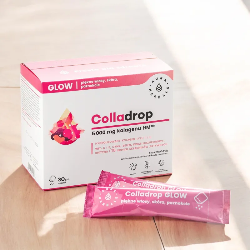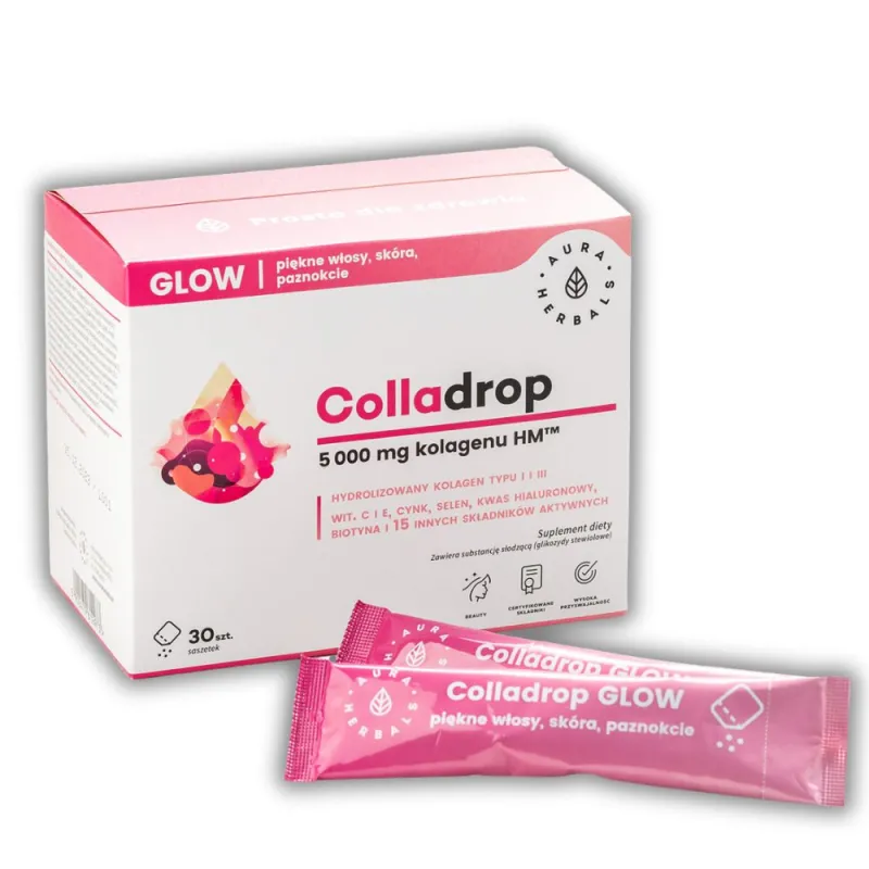 Colladrop Glow to wysokiej jakości suplement diety od Aura Herbals, zawierający 5000 mg kolagenu morskiego w każdej saszetce. Produkt został opracowany dla osób pragnących wspierać zdrowie skóry, włosów i paznokci. Dzięki wygodnej formie saszetek suplementacja jest precyzyjna i łatwa w codziennym stosowaniu.