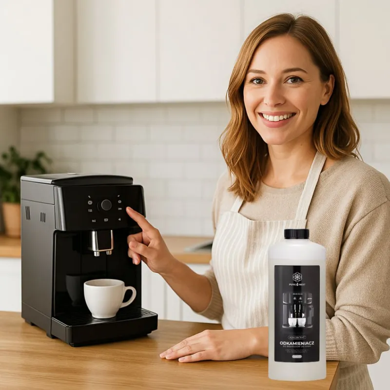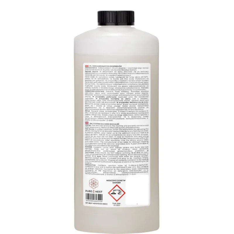 PURE NEST to uniwersalny odkamieniacz do ekspresów do kawy, oparty na naturalnym kwasie mlekowym – skuteczny dla kamienia, a jednocześnie bezpieczny dla aluminium, grzałek, pomp i uszczelek.