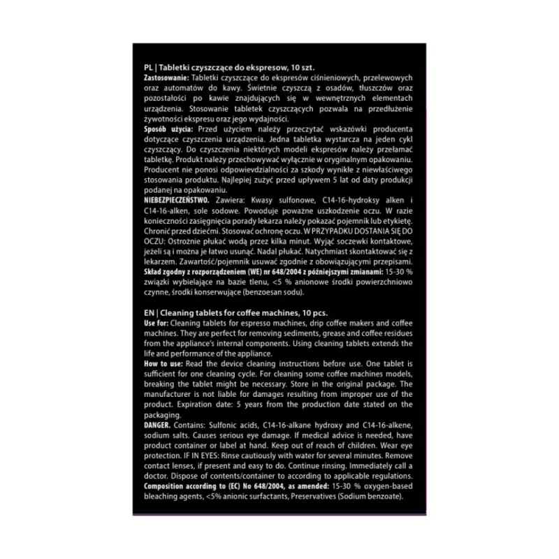 Produkt przeznaczony jest wyłącznie do czyszczenia ekspresów do kawy i należy go stosować zgodnie z instrukcją producenta urządzenia. Zawiera substancje czyszczące i może powodować poważne uszkodzenie oczu. Należy chronić produkt przed dziećmi oraz unikać kontaktu z oczami i skórą. Nie połykać. W przypadku dostania się produktu do oczu należy ostrożnie płukać je wodą przez kilka minut, usunąć soczewki kontaktowe, jeżeli są i można je łatwo usunąć, a następnie kontynuować płukanie. W razie potrzeby skontaktować się z lekarzem. Produkt przechowywać w oryginalnym, szczelnie zamkniętym opakowaniu. Pełna karta charakterystyki dostępna jest na życzenie.