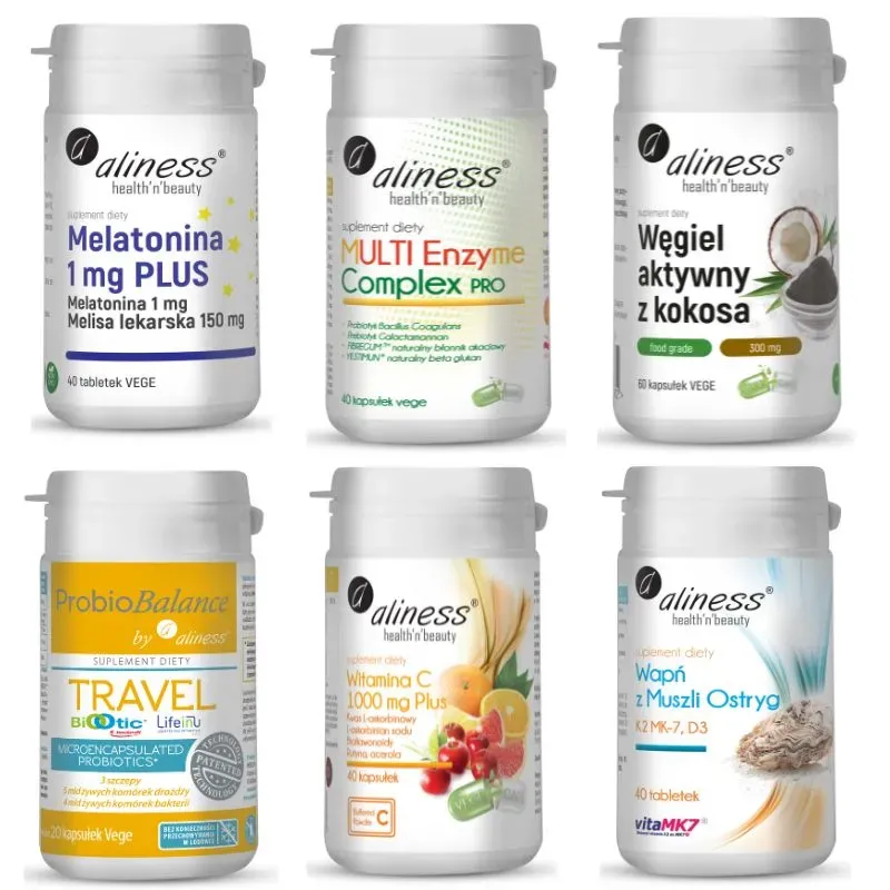 Zestaw Aliness® Travel Set to kompleksowy pakiet suplementów diety, zaprojektowany z myślą o osobach podróżujących, dbających o zdrowie i dobre samopoczucie w każdych warunkach. Zestaw zawiera sześć kluczowych produktów wspomagających sen, trawienie, odporność, zdrowie kości oraz usuwanie toksyn.