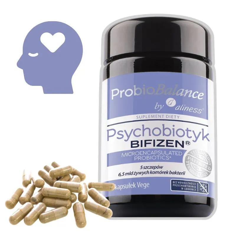Aliness ProbioBALANCE Psychobiotyk BIFIZEN to zaawansowany suplement diety wspierający zdrowie psychiczne i układ pokarmowy, idealny dla osób dbających o swoje zdrowie i samopoczucie.