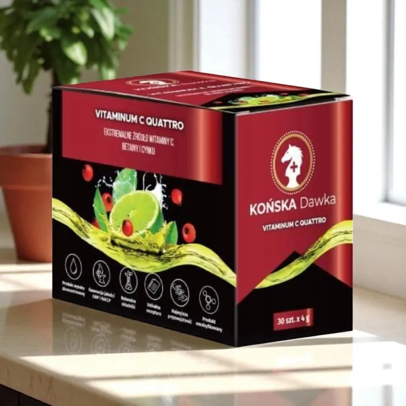 Odkryj Końską Dawkę Witaminy C Quattro 30 saszetek – unikatowy suplement diety w formie wygodnych saszetek, łączący cztery naturalne źródła witaminy C. Ta wysoko skoncentrowana formuła, wzbogacona ekstraktami z aceroli i dzikiej róży, wspiera odporność i chroni przed stresem oksydacyjnym. Wyprodukowana w Polsce bez sztucznych dodatków, idealna dla osób aktywnych i dbających o zdrowie. Moc natury w każdej saszetce!