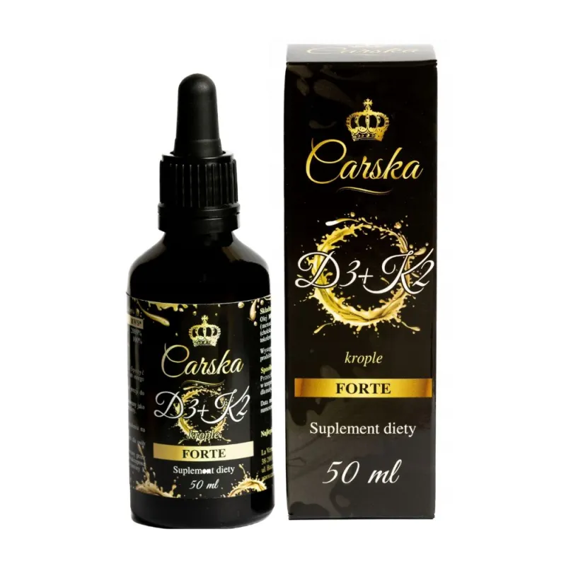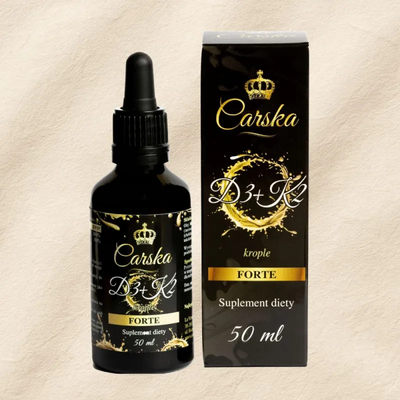 Carska Witamina D3 + K2 MK-7 FORTE to wysoko skoncentrowany suplement diety w kroplach, łączący dwie kluczowe witaminy rozpuszczalne w tłuszczach – witaminę D3 oraz witaminę K2 w najlepiej przebadanej formie MK-7. Produkt został opracowany z myślą o codziennej, wygodnej suplementacji oraz maksymalnej biodostępności składników aktywnych.