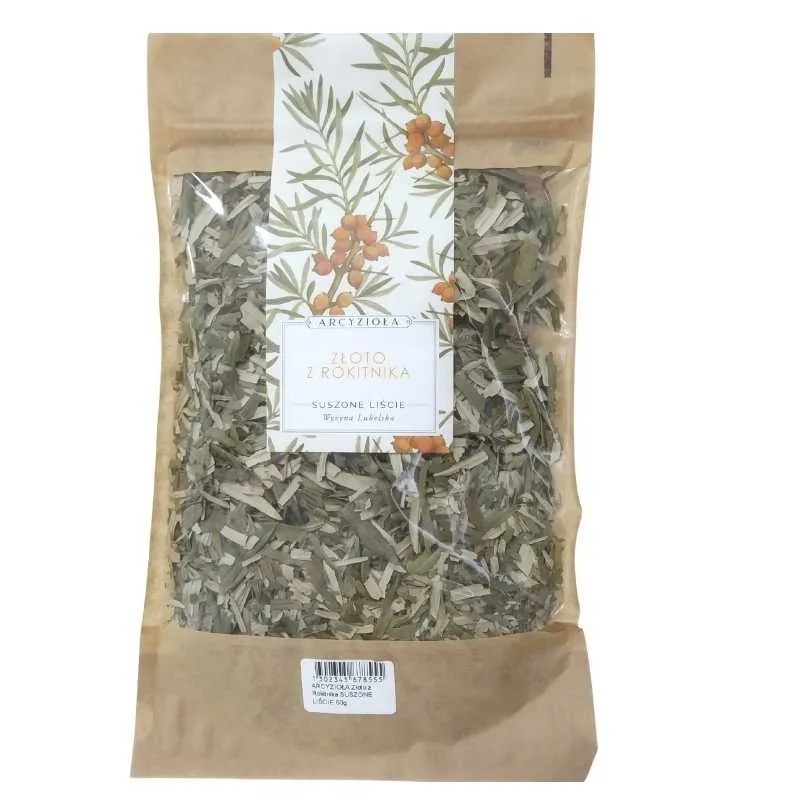 liście rokitnika, zbierane ręcznie. Obecność kawałków rośliny oraz suszone owoce nie są wadą produktu.