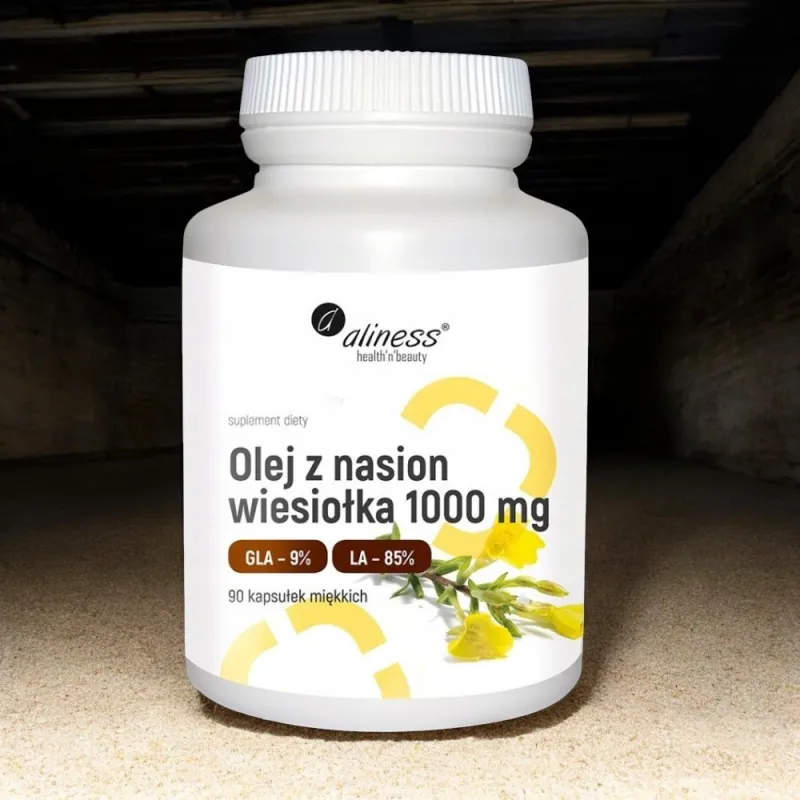 Aliness Olej z Nasion Wiesiołka 1000 mg to naturalne wsparcie zdrowia w jednej kapsułce. Produkt dostępny w opakowaniu 90 kapsułek, co wystarcza na pełną, trzymiesięczną kurację. Skuteczny, bezpieczny, z naturalnych składników – wybierz zdrowie i piękno dzięki mocy natury!