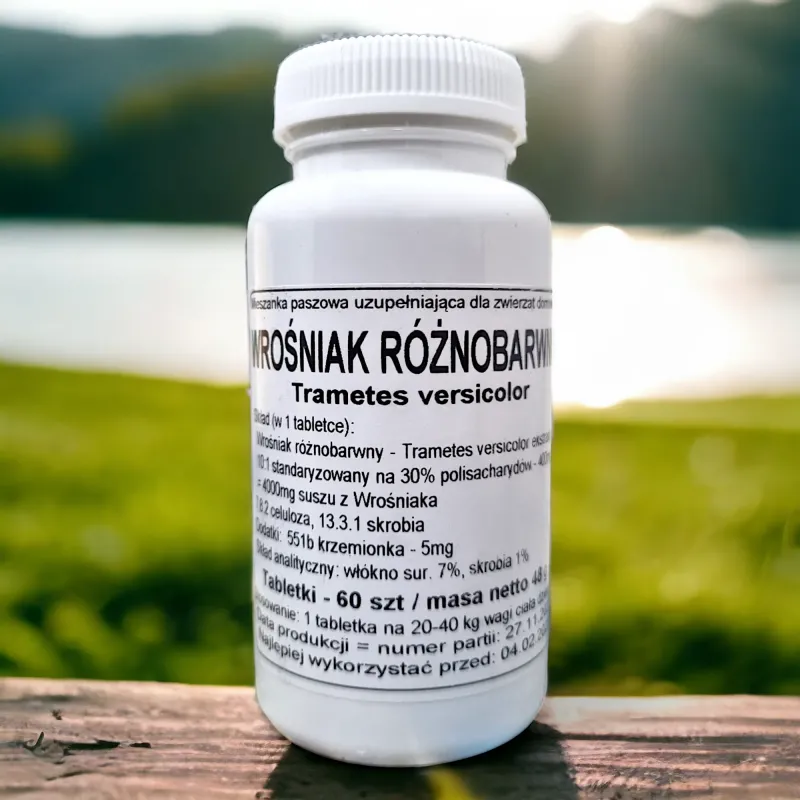 Ekstrakt Wrośniaka Różnobarwnego 400mg - Podkowa to wysokiej jakości mieszanka paszowa uzupełniająca, stworzona z myślą o wsparciu zdrowia i odporności zwierząt domowych, takich jak psy, koty i konie. Produkt zawiera skoncentrowany ekstrakt 10:1 z wrośniaka różnobarwnego (Trametes versicolor), standaryzowany na 30% polisacharydów, co odpowiada 4000 mg suszu grzybowego w każdej tabletce. Znany w tradycyjnej medycynie Dalekiego Wschodu, wrośniak różnobarwny dostarcza bioaktywnych związków, takich jak polisacharydy PSK i PSP, wspierających układ immunologiczny i ogólną witalność.