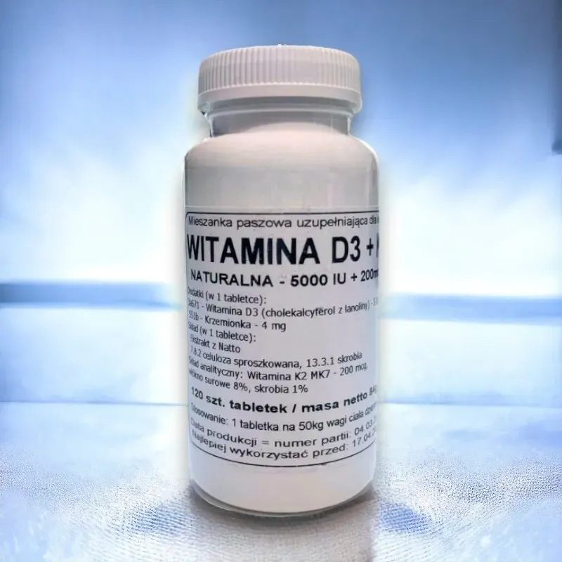 Podkowa Witamina D3 5000 IU + K2 MK-7 to wysokiej jakości mieszanka paszowa uzupełniająca, stworzona z myślą o wsparciu zdrowia kości, stawów i układu odpornościowego zwierząt domowych, takich jak psy, koty i konie. Produkt zawiera naturalne witaminy D3 (cholekalcyferol z lanoliny) oraz K2 MK-7 (menachinon z natto), które działają synergicznie, zapewniając optymalne wchłanianie wapnia i ochronę układu sercowo-naczyniowego. Opakowanie zawiera 120 tabletek, co gwarantuje wygodne i długotrwałe stosowanie.