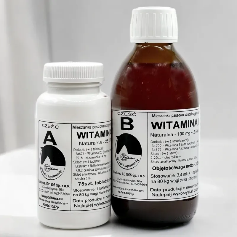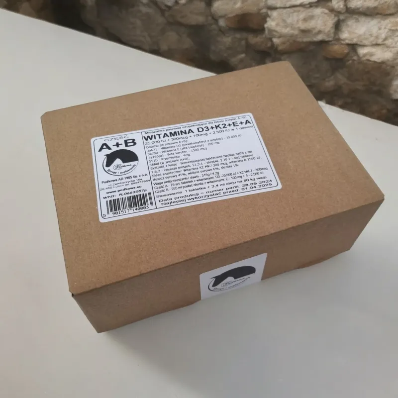 Podkowa Witamina D3 25.000 IU + K2 + E + A to specjalistyczna mieszanka paszowa uzupełniająca, stworzona z myślą o kompleksowym wsparciu zdrowia zwierząt domowych, takich jak psy, koty i konie. Produkt składa się z dwóch części: tabletek z witaminami D3 i K2 MK-7 oraz oleistej formy z witaminami E i A, zapewniając optymalne wchłanianie witamin rozpuszczalnych w tłuszczach. Ta formuła wspiera zdrowie kości, układ odpornościowy, skórę i ogólną kondycję zwierząt. Opakowanie zawiera 75 tabletek oraz 255 mg oleju, co zapewnia wygodne dawkowanie i długotrwałe stosowanie.
