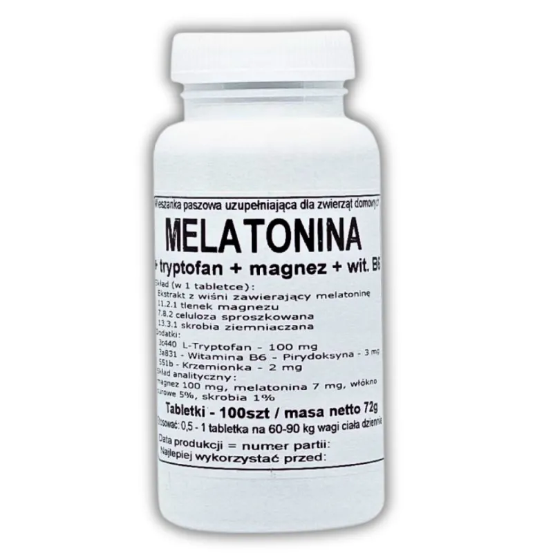 - Synergiczne działanie: Połączenie melatoniny, tryptofanu, magnezu i witaminy B6 wspiera sen, relaks i regenerację, działając kompleksowo na organizm zwierzęcia.