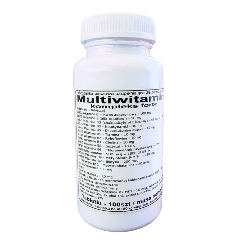 Odkryj siłę natury z Multiwitamina Kompleks Forte – Tabletki dla Psa, Kota i Konia 90 szt. Podkowa, wszechstronnym suplementem diety wspierającym zdrowie Twoich pupili. Każde opakowanie zawiera 90 tabletek (80 g), dostarczając bogaty zestaw witamin i minerałów, w tym witaminę C (100 mg), E (50 mg), D3 (1000 IU), kompleks B (B1, B2, B3, B5, B6, B7, B9, B12), beta-karoten (1500 IU), krzemionkę (6 mg) oraz ekstrakty z rokitnika i natto. Formuła została zaprojektowana, by wspierać odporność, witalność, jakość sierści i ogólną kondycję zwierząt, niezależnie od rasy czy wieku. Tabletki można dzielić, co ułatwia dawkowanie (1 tabletka na 60-80 kg wagi ciała lub wg zaleceń weterynarza).