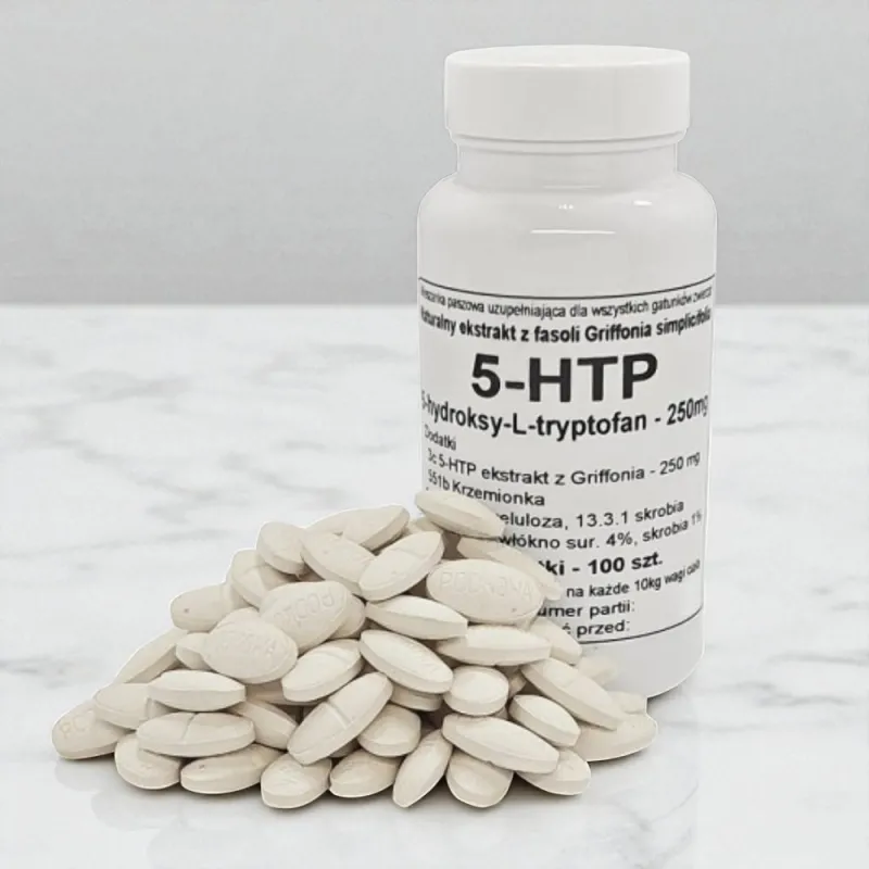 Suplement marki Podkowa w formie tabletek zawierający 5-hydroksy-L-tryptofan (5-HTP) w wysokiej dawce 250 mg. Produkt przeznaczony jako mieszanka paszowa uzupełniająca dla zwierząt domowych oraz koni.